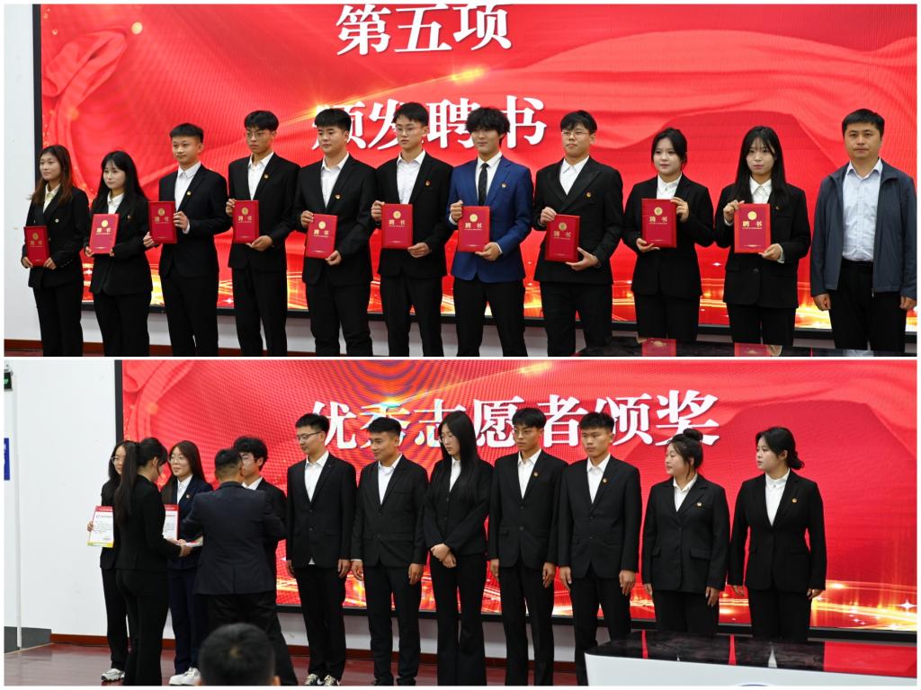与会领导为新一届校学生会成员代表颁发聘书,并为2025年临沂市马拉松优秀志愿者代表颁发荣誉证书。