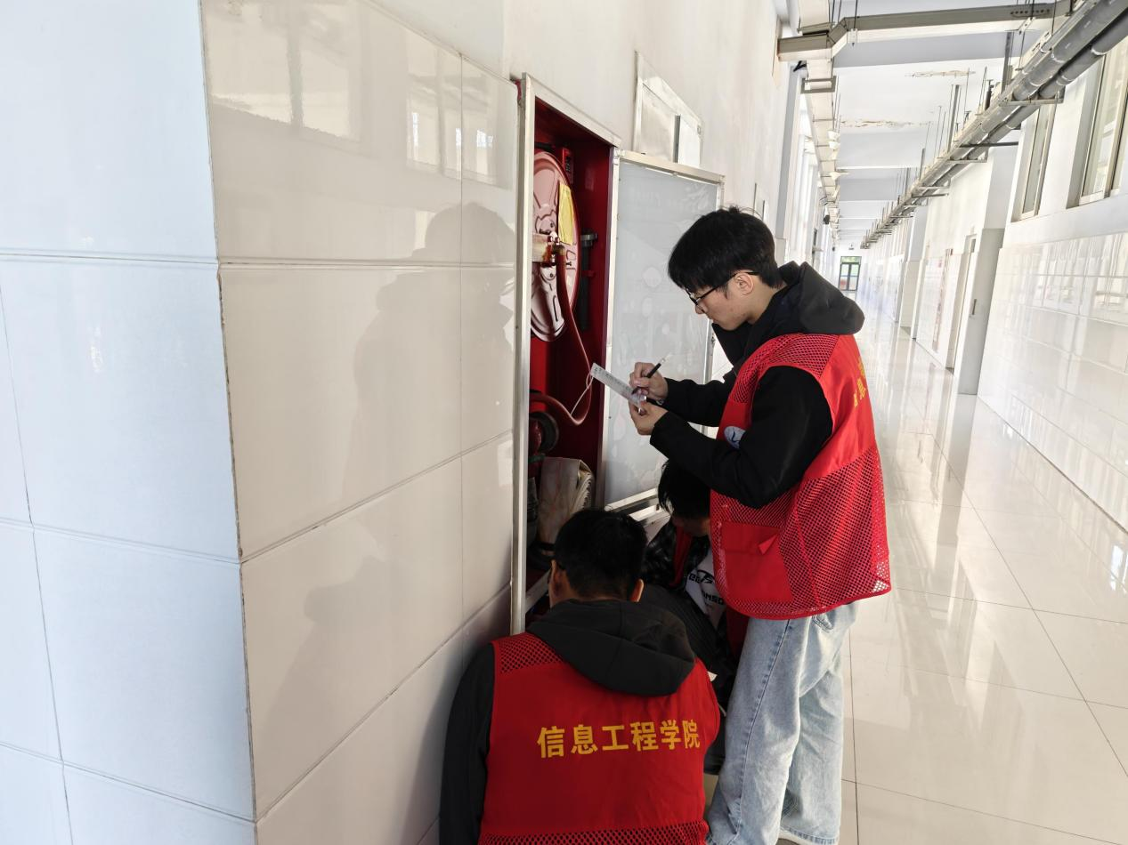 在教室、宿舍、实训室等重点区域,志愿者们开展了细致的消防安全隐患排查,重点检查了消防通道、灭火器、应急灯等消防设施状态是否良好,构建起校园安全防线。