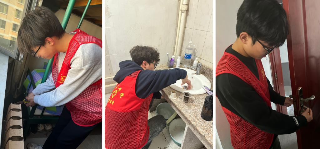 本次活动聚焦供暖季临近、生活设施偶发故障等同学们的实际需求,以“冬天即将来,温暖不缺席”为主题,志愿者们对宿舍暖气片进行了“拉网式”检查,提前排查宿舍暖气片,逐间检测温度、排查漏点,紧固接口、清理积尘,让暖流如期送达,为冬日校园添暖意。针对宿舍门锁松动、门关闭不严的情况,维修队及时更换损坏锁具,调试门锁灵敏度,阻挡寒风吹进宿舍,让寝室温暖的同时也温暖了同学们的心。接到洗手台漏水反馈,维修小队快速响应,更换老化零件、疏通堵塞管道,动作娴熟有条不紊,解决了困扰同学们日常生活的难题,畅通的不仅是下水管道,更是服务同学的“连心通道”。